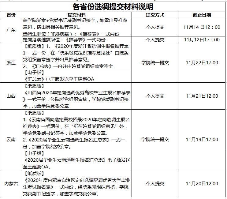 以上各省选调生材料请在公司要求的基础上提前两天提交到公司进行审核、签字、盖章。