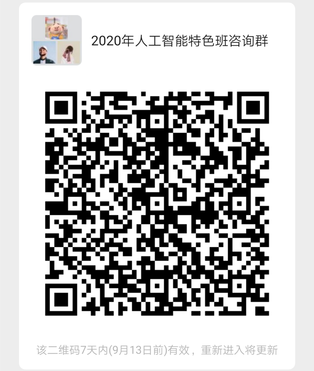 受疫情影响,2020年特色班二次选拔无法进行线下宣讲,欢迎所有有志成为智能拔尖人才的新生加入人工智能特色班,扫描二维码进入微信群交流!