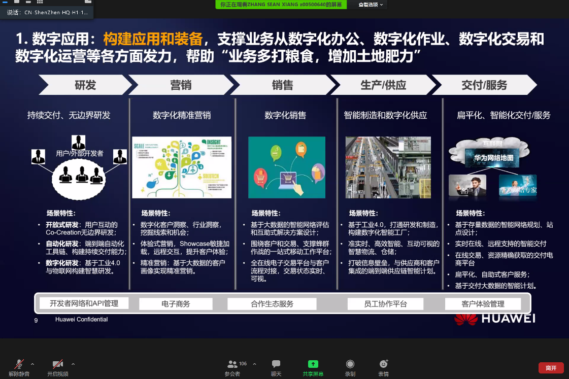 张老师介绍到,华为公司的愿景是把数字世界带入华为,构建全联接的智能华为,使公司数字转型化成功。同学们了解到华为公司消费者业务、运营商业务、企业业务、云业务等四个业务和研发、销售、供应、HR等价值流。谈及数字应用和构建HIS数字平台两方面,张老师通过流程图、现场视频和AR视频为大家进行了细致的讲解.
