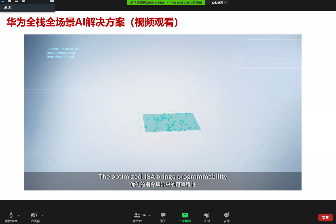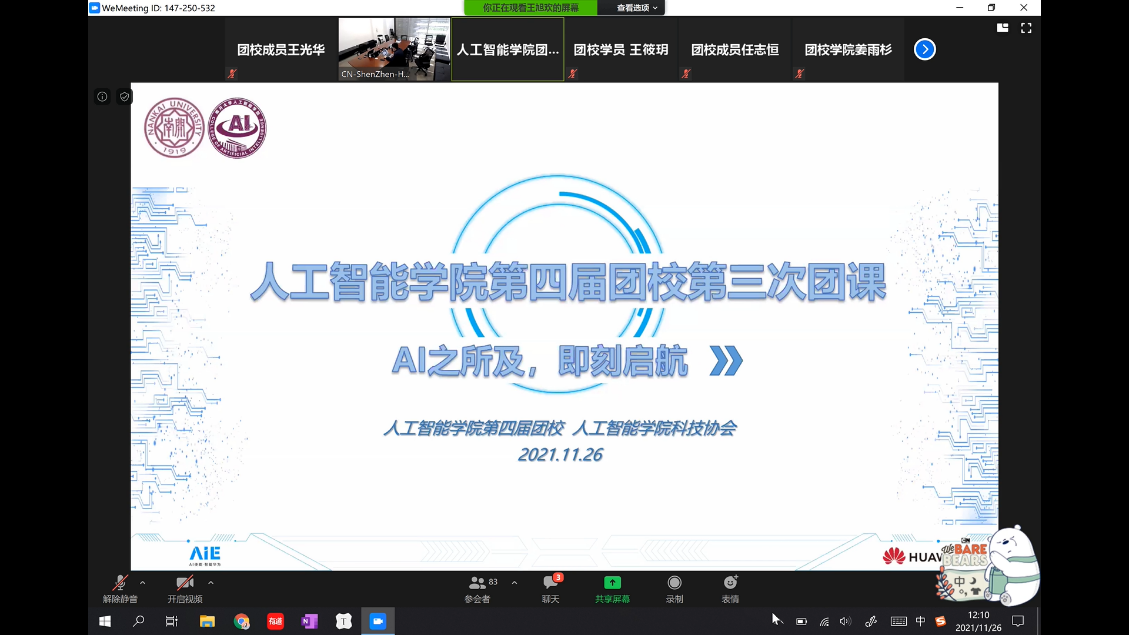 为使同学们更深入地了解数字转型化时代下人工智能在华为各领域的应用,激发起大家对本专业和国家优秀企业的兴趣和热情,betway88西汉姆联第四届团校与科技协会于11月26日中午12:10在线上联合举办了团校第三次团课暨科技文化节系列活动——“智能世界,智能华为”,邀请到华为流程IT SaaS领域首席AI解决方案架构师张翔老师进行交流分享。全体团校学员和对此方面有兴趣的同学参加了此次活动。