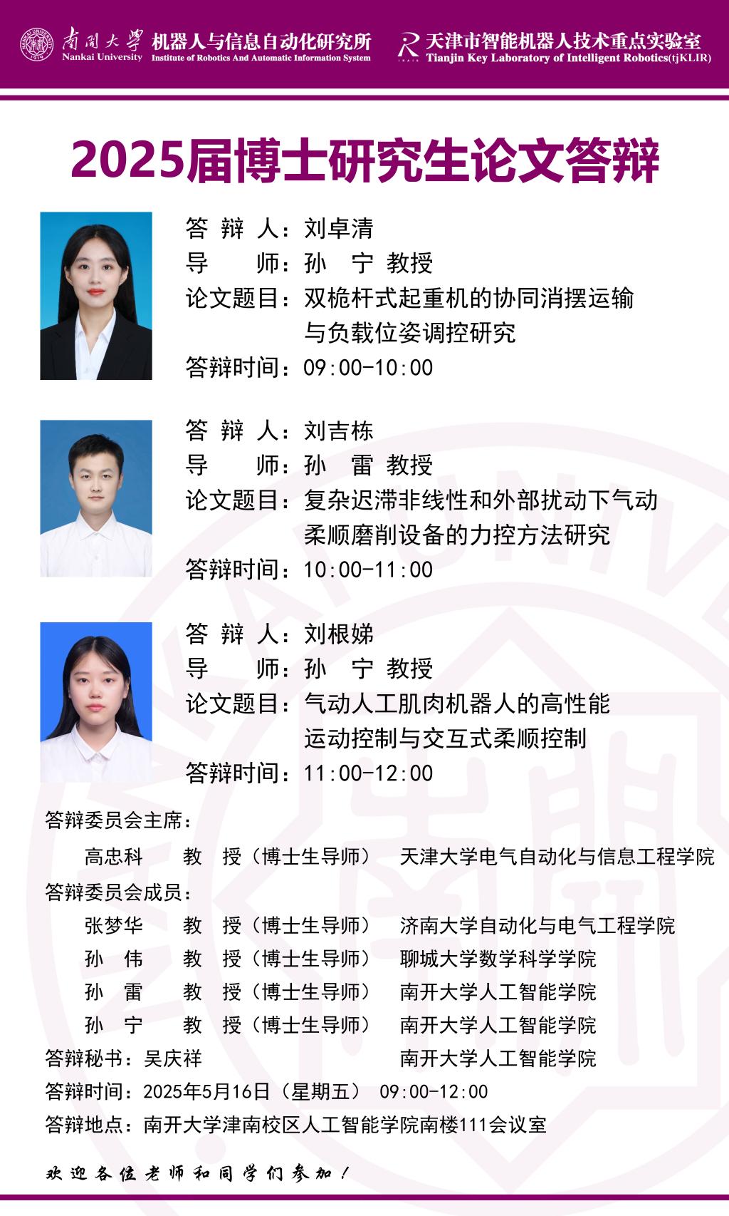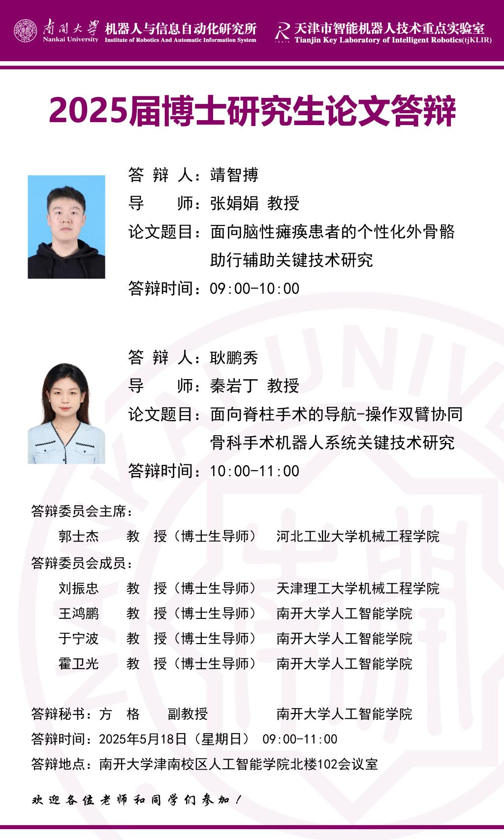 【答辩】2025届夏季毕业答辩公告----机器人与信息自动化研究所(博士)
